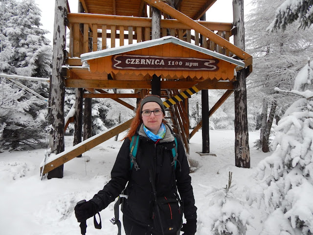 Na Czernicy znajduje się rewelacyjna wieża widokowa, która musi oferować niezapomniane panoramy. Niestety, nie było mi dane zobaczyć ich tym razem, gdyż po wspaniałym błękitnym niebie z sobotniego poranka zostało już tylko wspomnienie. Nic straconego, bo jeszcze w lutym planujemy zrobić kolejne przejście przez Góry Złote i Bialskie, a tak się składa, że obejmuje ono również Czernicę. Chwila przerwy na jedzenie i zachwyt nad mijającym dniem przydaje się każdej z nas, jednak trzeba schodzić, bo zmrok już za pasem, a do auta zostało jeszcze 90 minut wędrówki.