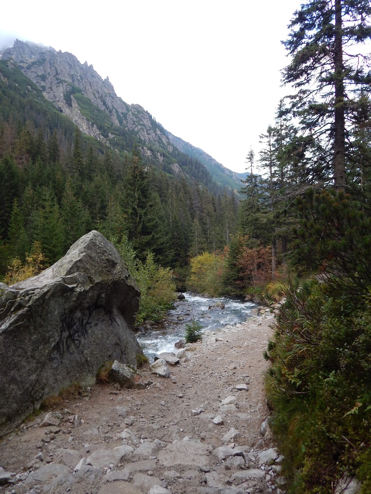 By uczynić ten dzień jeszcze piękniejszym, poświęciłam dłuższą chwilę na postój w schronisku przy Morskim Oku. Po tak długim odwyku kawa za kilka złotych smakowała mi jak Dom Pérignon. Pełna dobrej energii ruszyłam wspomnianą ceprostradą. Droga na Szpiglasową Przełęcz jest bardzo przyjemna, bo nie daje mocno odczuć pokonywanych przewyższeń, a przy dobrej pogodzie gwarantuje niezapomniane widoki na Czarny Staw pod Rysami, Rysy, Mięguszowieckie Szczyty i oczywiście Mnicha. Ostatniego dnia września zima pokonała tu jesień i w wyższych partiach widoczność znacząco spadła.